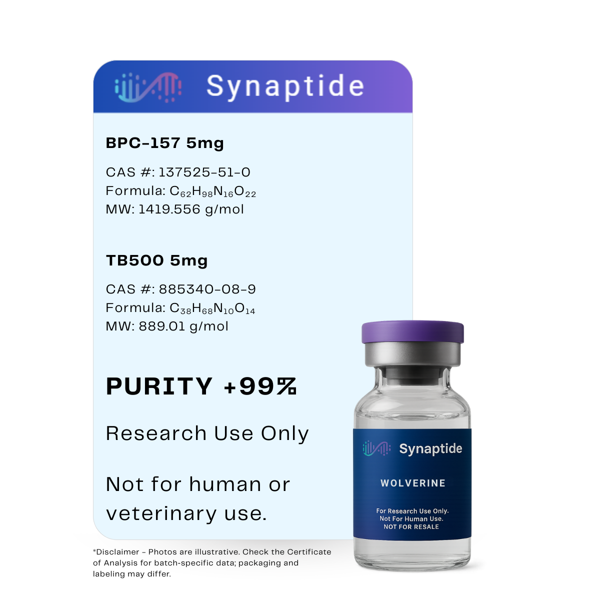 Wolverine is a research peptide combination consisting of BPC-157 and TB-500. These peptides are commonly studied in preclinical models investigating cellular repair processes, angiogenesis, cytoskeletal remodeling, and tissue regeneration. Researchers have examined these compounds in experimental settings related to musculoskeletal injury models, including tendon, ligament, and soft tissue recovery, as well as cellular migration and wound healing mechanisms. The combination is sometimes explored in research to evaluate potential synergistic effects on tissue repair pathways and vascularization.